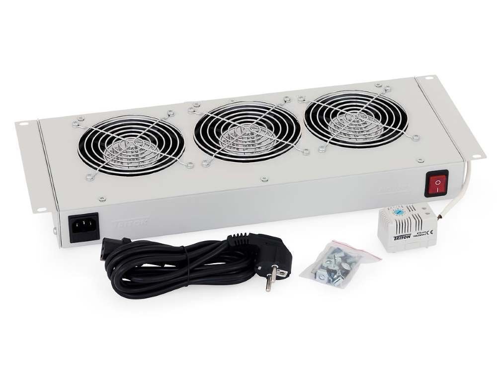 Ventilační jednotka se třemi ventilátory a bimetalovým termostatem určená pro 19" nástěnné rozvaděče.