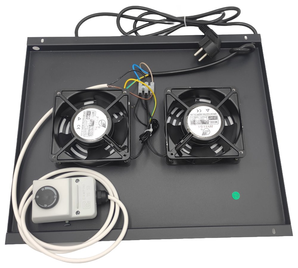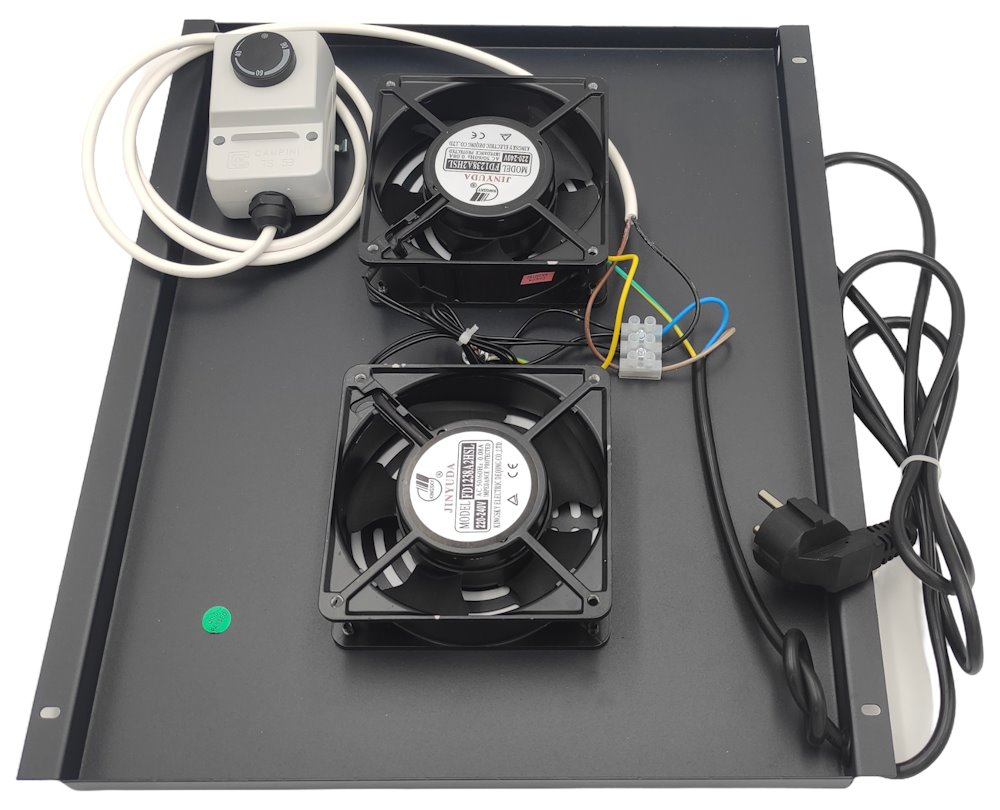 Stropní/podlahový ventilátor do stojanových rozvaděčů řady ECO, 2 ventilátory o průměru 12 cm. Termostatický spínač s nastavitelnou teplotou.