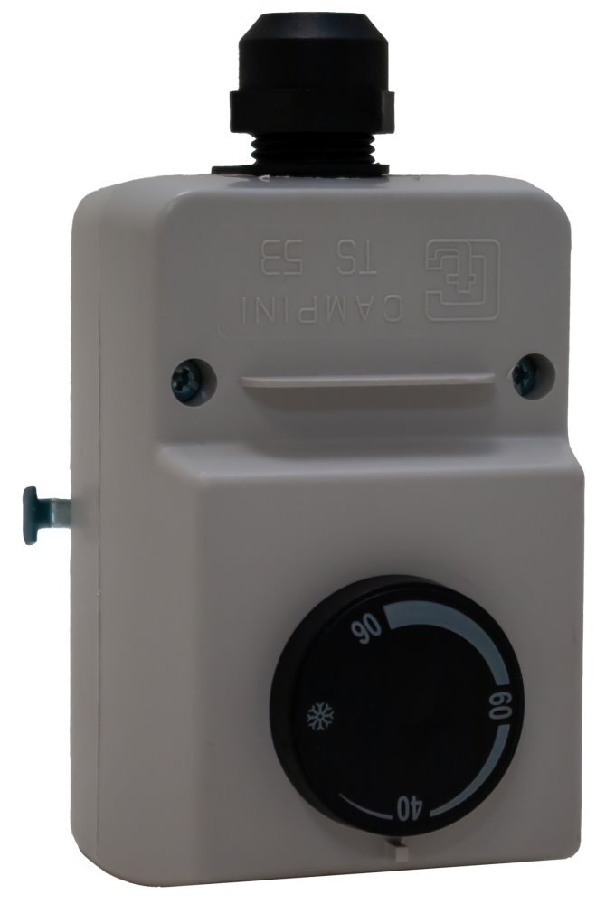 Termostatický spínač vhodný pro spínání ventilace. Připevnění pružně kovovou pružinou, přepínací kontakt.