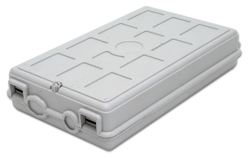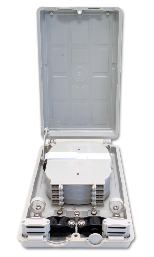 Malý plastový rozvaděč pro odbočkování nebo zakončení optického vedení pomocí pigtailů, 24 (2× 12) svarků, 2 otvory pro průchozí kabel hlavního vedení, 2 výstupní porty pro celkem 24 pigtailových napojení. Uvnitř jsou 4 kazety a každá je pro 6 svarů.