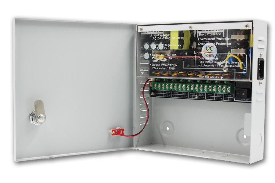 Stabilizovaný napájecí zdroj pro děvět spotřebičů, nastavitelné napětí DC 11-14V, každý port max. 1,5A. Celkový výstupní proud 10A, krátkodobě 12A. Skříňka na zeď s instalovaným PCB, kabelové průchodky. Připojení kabelů k interní svorkovnici. Ochrana proti zkratu PTC termistrory, 1,5A na port. LED signalizace funkčnosti portů.