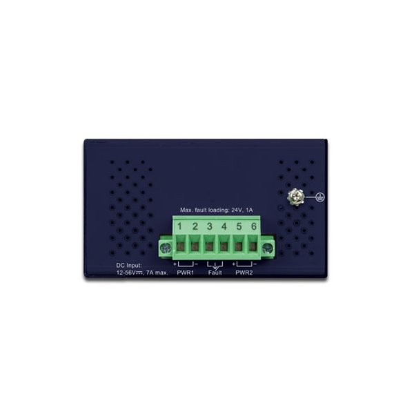 Možnost redundantního napájení DC 12-56 V, krytí IP40, kovová skříň, pracovní teplota -40 až +75 °C, fanless (bez ventilátorů), LED indikace využití PoE.
