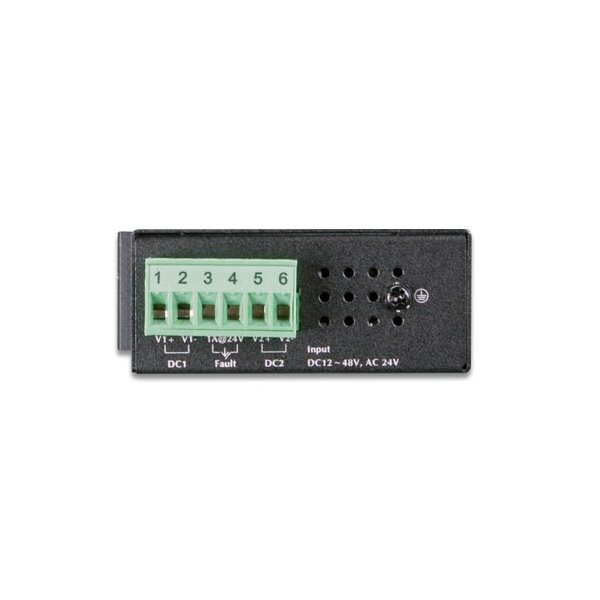 5portový 100Mbitový přepínač a konvertor pro průmyslové aplikace. Možnost redundantního napájení DC 12-48V / AC 24V, příkon <2W.