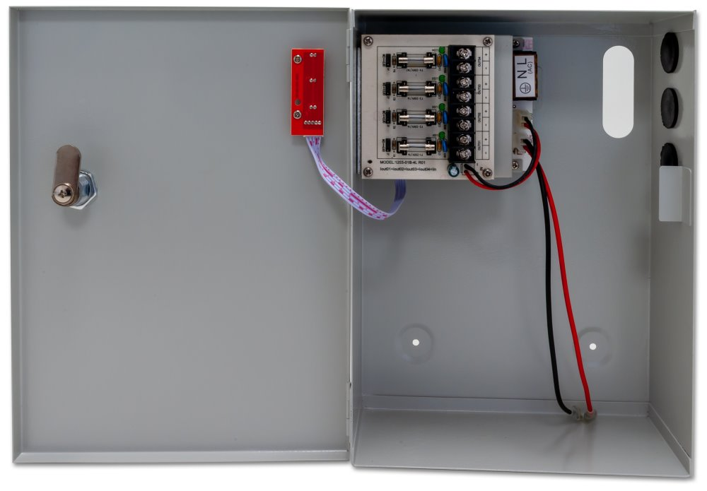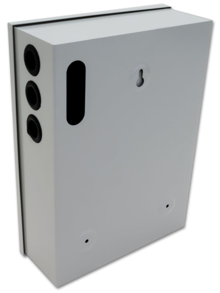 Stabilizovaný napájecí zdroj pro čtyři spotřebiče s okruhem pro nabíjení a připojení záložní baterie. Celkový výstupní proud 3 A. Skříňka na zeď s instalovaným PCB, kabelové průchodky, vypínač uvnitř skříňky. Připojení kabelů k interní svorkovnici, možnost odpojení výstupu propojkou bez nutnosti odpojování vodičů. Ochrana proti zkratu přístrojovou pojistkou, ochrana proti přepětí. LED diody diagnostikují stav portů, na první pohled je např. rozpoznatelná vyhořelá pojistka. Bateriový okruh dobíjen 1 A. Ochrana proti zkratu baterie a ochrana baterie proti úplnému vybití.