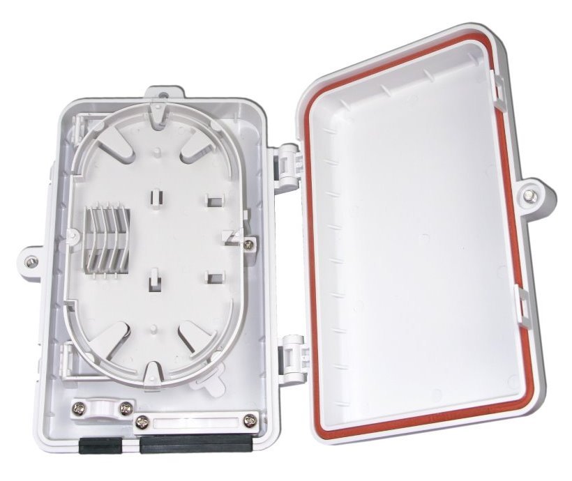 Vodotěsný nástěnný plastový rozvaděč. Typicky vhodné pro rozbočení vedení nebo napojení splitteru. Kabely jsou uchyceny ve šroubových třmenech a uzavření skříňky je na šroub.