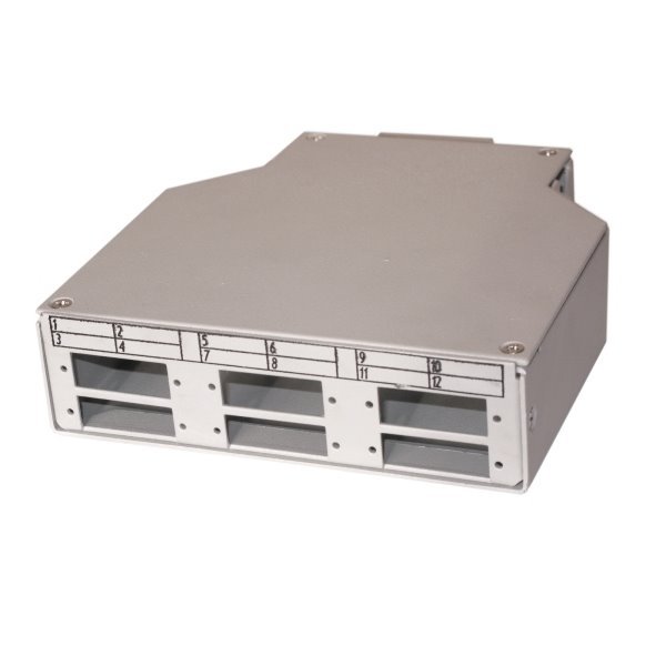 Malý kovový rozvaděč pro upevnění na DIN lištu. Dovoluje instalovat 6× SC duplexních nebo quad LC adaptérů. 4× otvor pro kabel. Kabel není nutno provlékat, lze i jen založit.