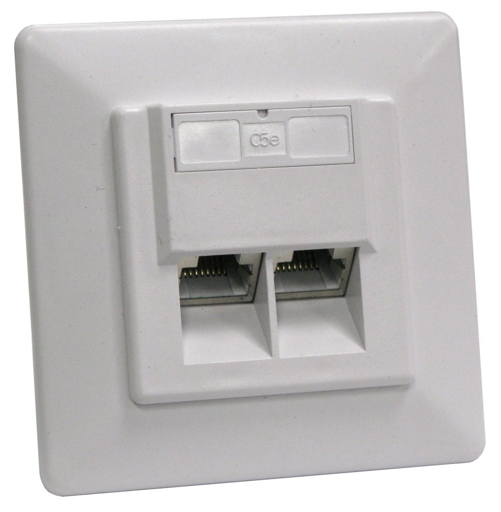 Zásuvka 2x RJ-45, stíněná, pod omítku. CAT5E, konektory RJ-45 orientovány šikmo v úhlu 45 st., barva bílá, montáž do krabice pod omítku, narážecí kabelové konektory (Duální - 110 i LSA). Instaluje se do běžných elektroinstalačních krabic.