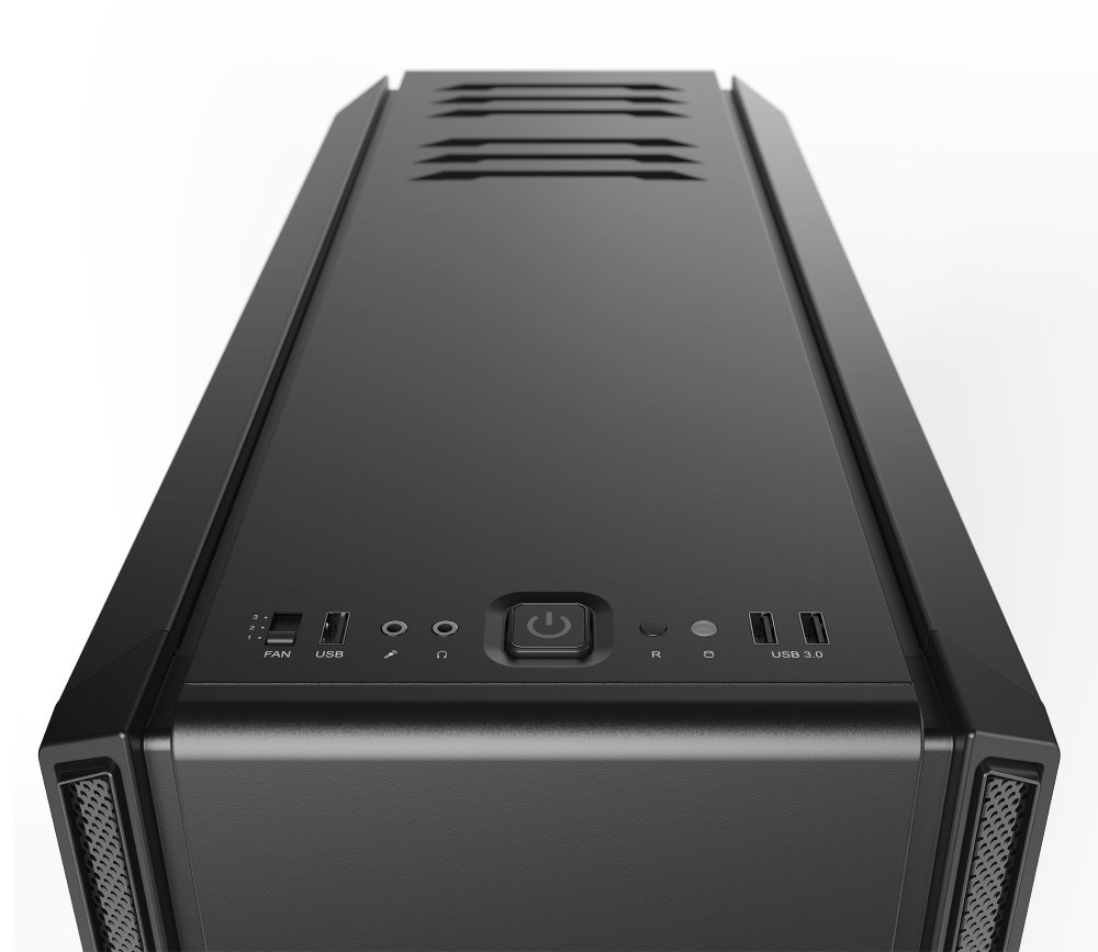 Konektory na horním panelu: 2 x USB 3.0, 1 x USB 2.0, 1 x výstup pro sluchátka, 1 x vstup mikrofonu, regulátor otáček ventilátorů