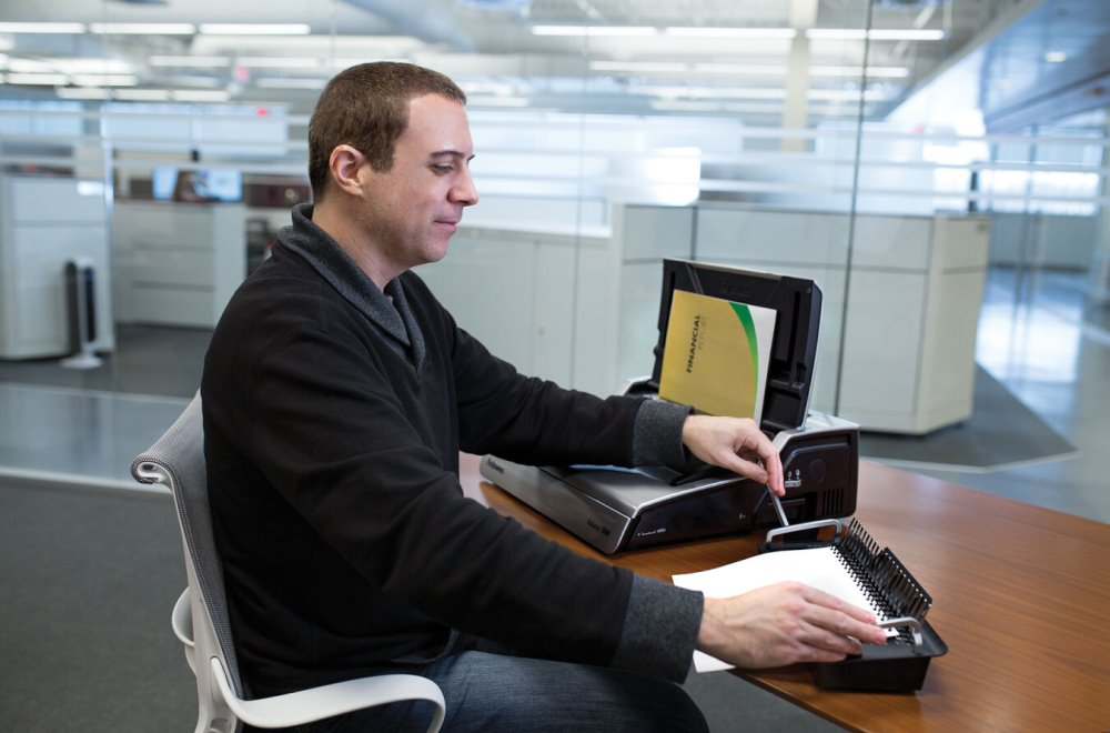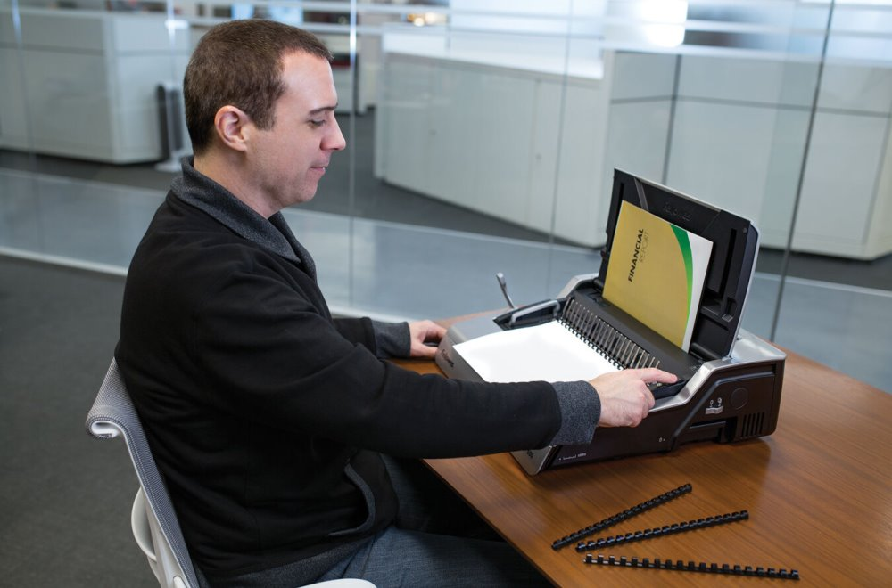 Elektrický vázací stroj vhodný pro intenzivní využití v kanceláři nebo i při poskytování služeb v menším copy centru. Pro rychlý výběr formátu děrovaného dokladu slouží 3 tlačítka na horní straně přístroje. Stroj je vybaven zásobníkem na uložení hřbetů a integrovanou měrkou pro správnou volbu průměru hřbetu. Součástí balení sada 20 obálek a hřbetů.