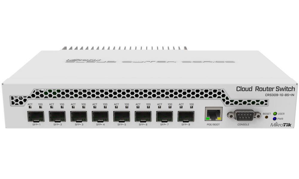 Cloud Router Switch CRS309-1G-8S+ má dva operační systémy. Lze si zvolit mezi RouterOS MikroTik a SwOS. Kapacita switche je 162 Gbps a podporuje 10 Gbit SFP+ moduly.