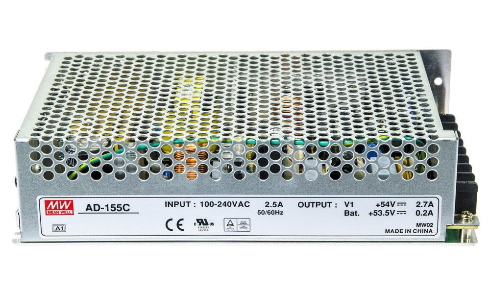 Průmyslový dvouhladinový napájecí zdroj se zálohovací funkcí (UPS), výstupní napětí 54 V + 53,5 V (baterie), zatížitelnost 155 W (max. 156,5 W). Ochrana proti vyčerpání baterie, přetížení a přepětí. Provozní teplota -10 až +60 °C.