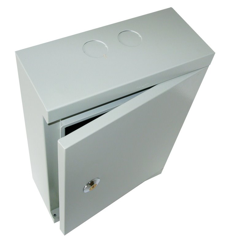 Univerzální kovový rozvaděč na zeď s DIN lištou.