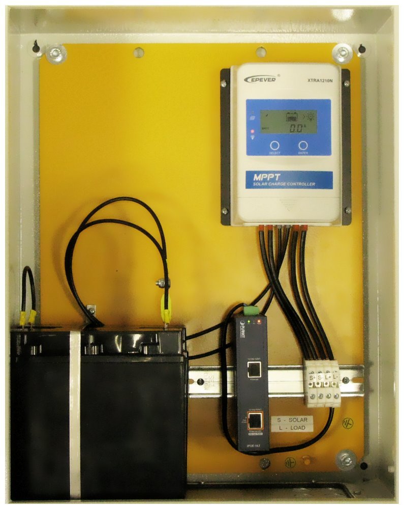 Použitý solární regulátor EPsolar je také zárukou dlouhé živostnosti v různých povětrnostních podmínkách.Použitá kapacita baterií je celkově 480 Wh, což je dostačující pro napájení zařízení s příkonem 20 W po dobu 20 h.