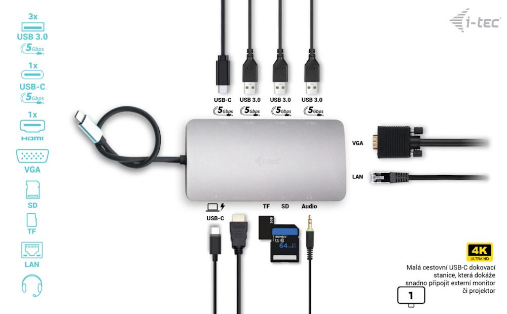 Stanice I-TEC USB-C Metal Nano Dock 100 W disponuje konektory pro připojení externího monitoru, projektoru, tiskárny, paměťových úložišť a samozřejmě také klávesnice nebo myši. Skrze rozhraní HDMI připojíte klidně 4K monitor. Pro starší Full HD modely je k dispozici VGA. Nechybí ani čtečka SD a microSD karet nebo třeba trojice portů USB. S pomocí konektoru USB-C můžete notebook nebo tablet napájet a přenášet data nebo obrazový obsah jediným kabelem.