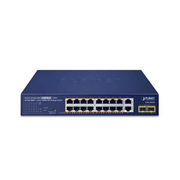 Gigabitový PoE+ přepínač, 18 x 10/100/1000Base-T RJ-45 s 16 injektory 802.3af/at, dva SFP sloty 1000Base-X, napájecí výkon až 185 W.