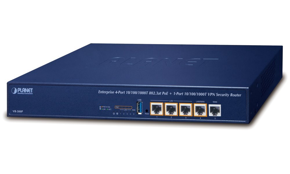 Gigabitový PoE bezpečnostní VPN router disponující pěti RJ-45 porty (4x PoE 802.3af/at, 120 W), firewallem, podporou dual WAN a se snadným nastavením pomocí webového rozhraní, SNMP, UNI-NMS nebo PLANET Smart Discovery. Jedná se o řešení "vše v jednom".