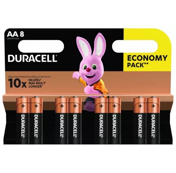 Baterie Duracell Basic jsou víceúčelové alkalické baterie vhodné pro běžné přístroje. Dokonalé uzavření horní části nylonem pomáhá předcházet vytečení baterií. Technologie Duralock udržuje nepoužívané baterie Duracell při běžném skladování jako nové a nabité po dobu až 10 let. Balení obsahuje 8 kusů baterií.