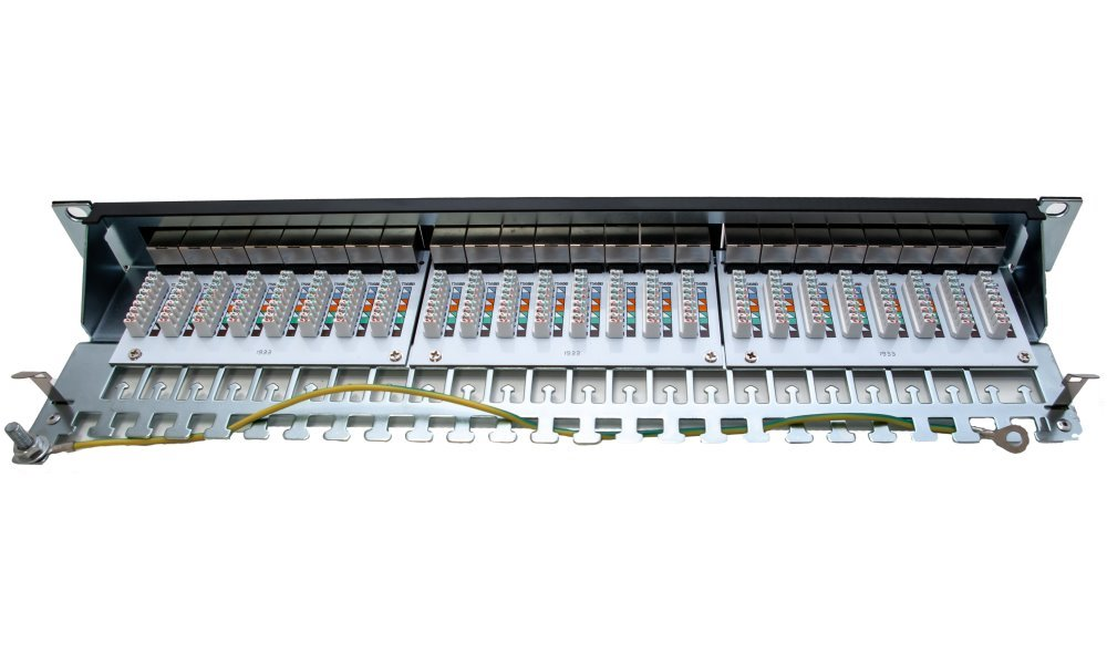 Propojovací patch panel osazený 24 porty kategorie Cat6a pro narážecí kontakty typu LSA a jeden PCB. Kontakty jsou pozlacené a na svorkovnici odlišené barvami podle typu zapojení, a to buď podle T568A, T568B nebo číselně značeny. Součástí těla panelu je vyvazovací lišta a zadní pravoúhlé vedení kabelů pro jejich pevné připevnění. Životnost zářezů je min. 200 použití a jsou určeny pro vodiče AWG 22-26. Zařízení splňuje normu TIA/EIA 568B.2-10 kategorie 6A.