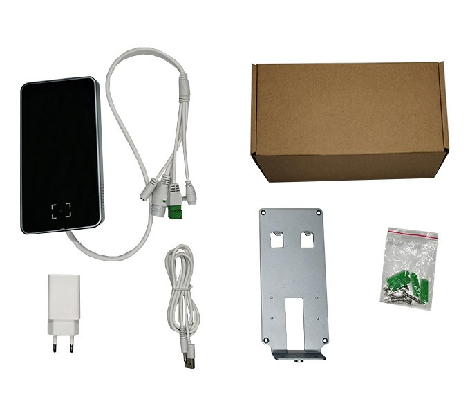 Obsah balení: čtečka, napájecí adaptér (DC 5 V), redukční USB-A kabel pro napájení, kovový držák, hmoždinky s vruty