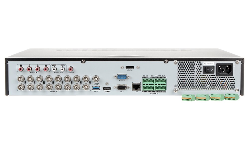 Porty: 16x BNC, 1x BNC video výstup, 1x HDMI 4K výstup, 1x VGA Full HD výstup, 2x USB 2.0, 1x USB 3.0, 1x RJ-45, 1x RS-232, 1x RS-485, 1x eSATA, 16x alarm vstup, 4x alarm výstup, 4x audio vstup, 2x audio výstup