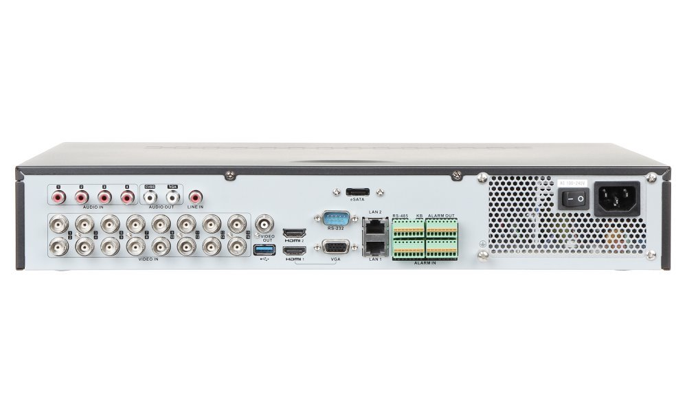 Porty: 8x BNC, 1x BNC video výstup, 1x HDMI 4K výstup, 1x HDMI Full HD výstup, 1x VGA Full HD výstup, 2x USB 2.0, 1x USB 3.0, 2x RJ-45, 1x RS-232, 1x RS-485, 1x rozhraní pro klávesnici (svorkovnice), 1x eSATA, 16x alarm vstup, 4x alarm výstup, 5x audio vstup, 2x audio výstup