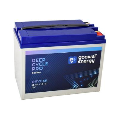 Záložní 12 V, 55 Ah olověný akumulátor v provedení VRLA (GEL) vhodný pro aplikace, kde dochází k častému a hlubokému vybíjení / cyklování, tedy hlavně pro pohony elektromotorů.