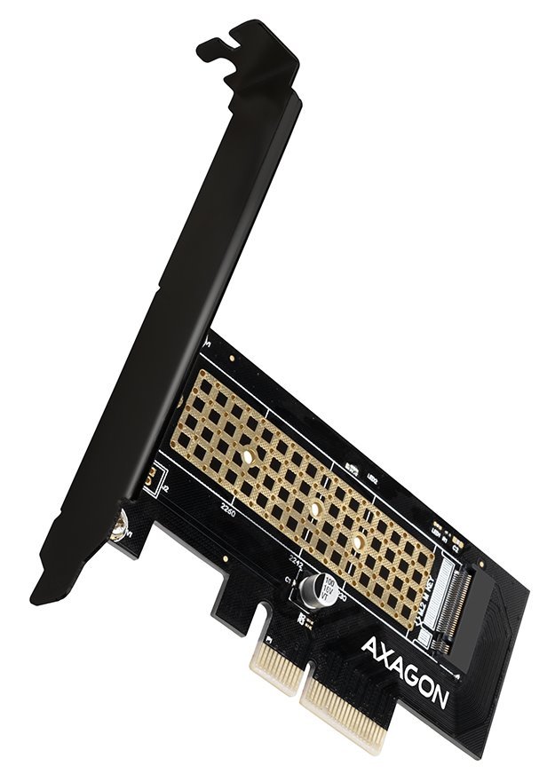 Řadič do slotu PCIe x4 pro připojení jednoho M.2 disku do velikosti až 80 mm. Adaptér je napájen přímo z PCIe sběrnice, není nutné externí napájení.