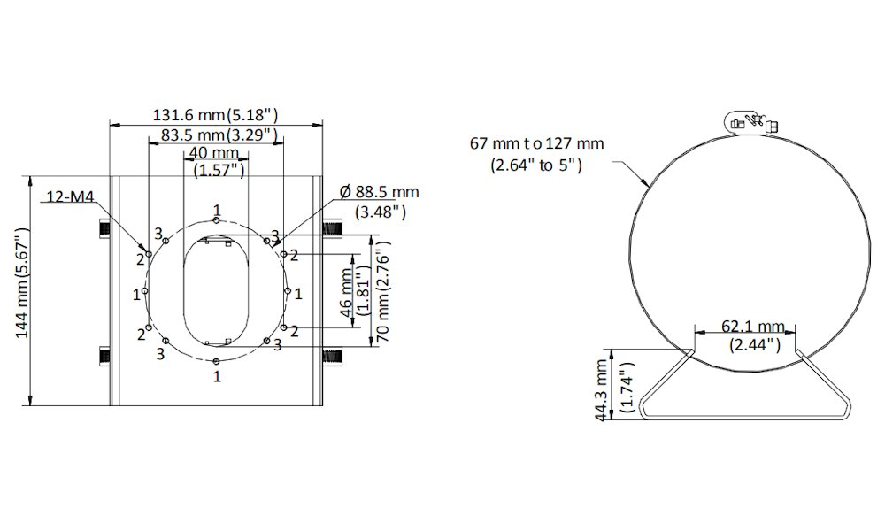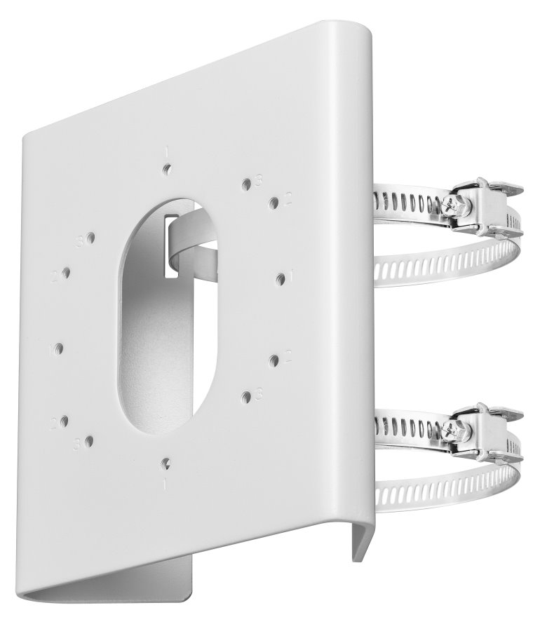 Držák pro montáž kamer na sloup/trubku, zatížitelnost 10 kg. Použitelné na trubku průměru 67 až 127 mm. Trubka musí unést více než 3krát větší hmotnost, než je celková hmotnost kamery a držáku.