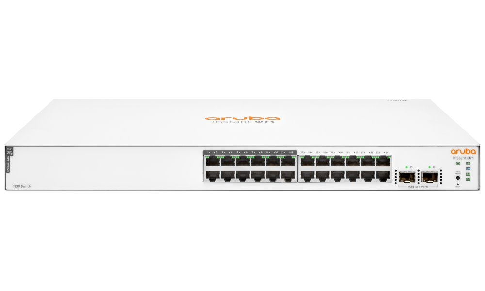 Spravovatelný PoE+ switch nabízející 24× 10/100/1000 Mbps RJ-45 portů (z toho 12× RJ-45 s podporou PoE+ 802.3af/at) a 2× 1 GbE SFP porty. Přepínací kapacita switche je 52 Gbps a rychlost směrování činí 38,68 Mpps. Mezi hlavní přednosti patří snadná tvorba oddělených VLAN, QoS nebo IGMP Snooping. Řada Aruba 1830 nabízí uživatelsky přívětivé webové rozhraní či mobilní aplikaci pro snadnou konfiguraci a správu.