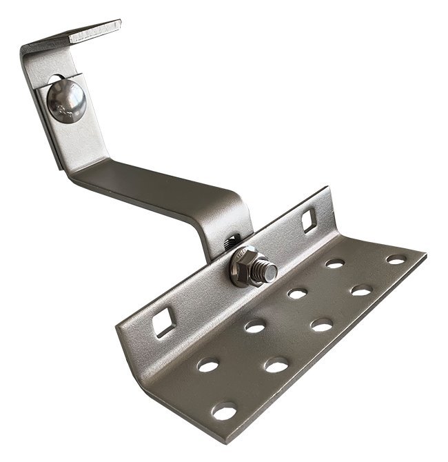Nastavitelný střešní hák pro připevnění solárních panelů na šikmé střechy s taškovou krytinou. Jeho nastavitelná konstrukce může montážníkům pomoci při správné instalaci a není třeba měnit háky, pokud jsou některé vzdálenosti špatně změřené. To může ušetřit čas a náklady.