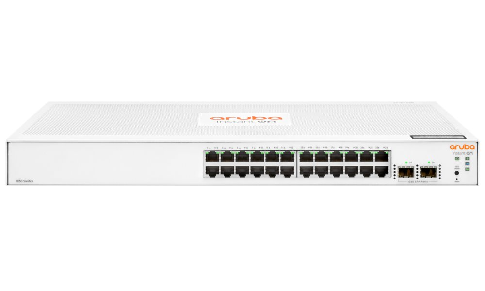 Spravovatelný switch nabízející 24x 10/100/1000 Mbps RJ-45 portů a 2x 1 GbE SFP porty. Přepínací kapacita switche je 52 Gbps a rychlost směrování činí 38,68 Mpps. Mezi hlavní přednosti patří snadná tvorba oddělených VLAN, QoS nebo IGMP Snooping. Řada Aruba 1830 nabízí uživatelsky přívětivé webové rozhraní či mobilní aplikaci pro snadnou konfiguraci a správu.