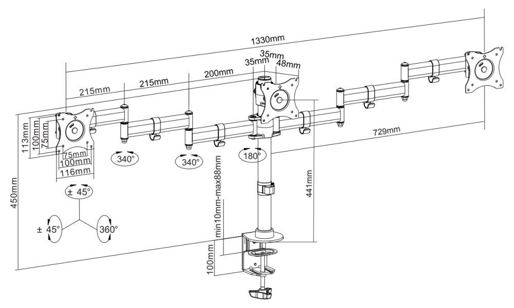 Flexibilní stolní VESA držák pro 3 ploché LCD monitory o velikosti 10" až 27" a hmotnosti do 24 kg (3× 8 kg). Držák je manuálně výškově nastavitelný v rozmezí od 0 do 49,8 cm. Stolní držák je vhodný pro obrazovky, které splňují vzor otvorů VESA 75 × 75 nebo 100 × 100 mm. Různé vzory otvorů lze pokrýt pomocí VESA adaptérů. Veškerý instalační materiál je součástí výrobku.