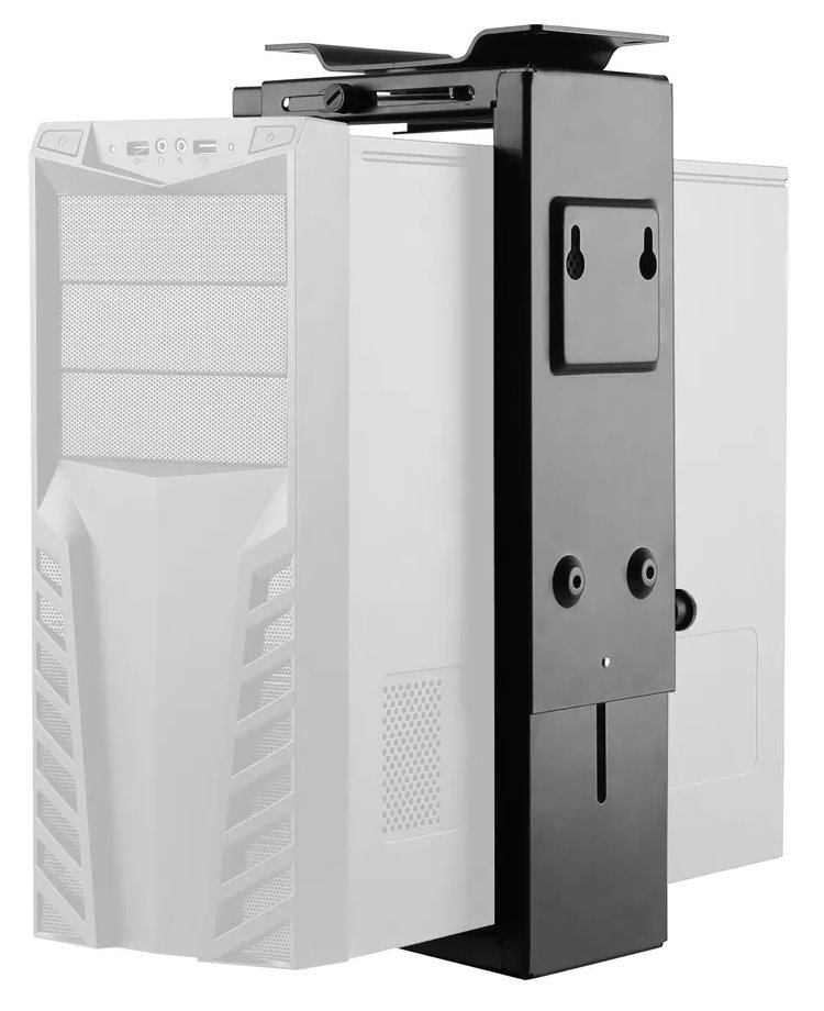 Otočný držák pro vertikální montáž počítače pod stůl či na stěnu. Snadno nastavitelná šířka a výška pro většinu stolních a věžových počítačů. Držák lze otáčet o 360°. Uvedené specifikace udávají maximální a minimální šířku a hloubku držáku.