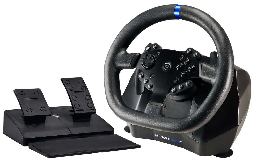 Volant s pedály SUPERDRIVE SV950 kompatibilní s herními konzolemi PlayStation (PS4), Xbox (One, X/S) a počítači. Volant se vyznačuje na pohled elegantním designem a díky zvolené struktuře se pohodlně a pevně drží. Dvojice vibračních motorů reaguje na všechny nerovnosti, na které během závodů najedete. Vše doplňuje systém pedálů, s nimiž získáte komplexní pocit z jízdy.