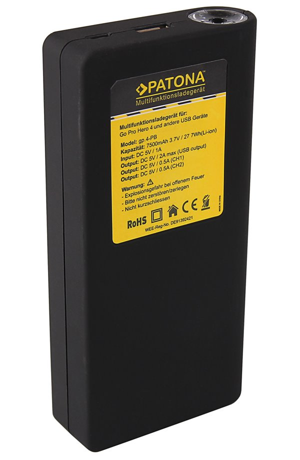 S nabíječkou Patona lze nabíjet současně 2 baterie GoPro Hero 4 najednou. Tato nabíječka slouží zároveň i jako powerbanka s kapacitou 7500 mAh, která je schopna nabíjet i další zařízení přes USB výstup, např. mobilní telefon. LED integrovaná lampa vám zase pohodlně posvítí na cestu. Nabíječky jsou vyráběny dle nejvyšších evropských standardů kvality a vyznačují se extrémně dlouhou životností, ochranou proti přehřátí a přebíjení.
