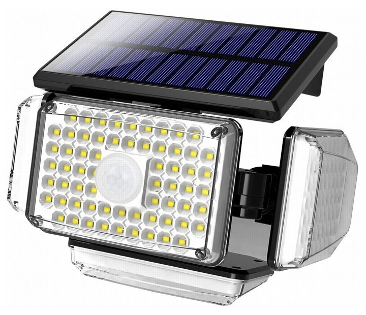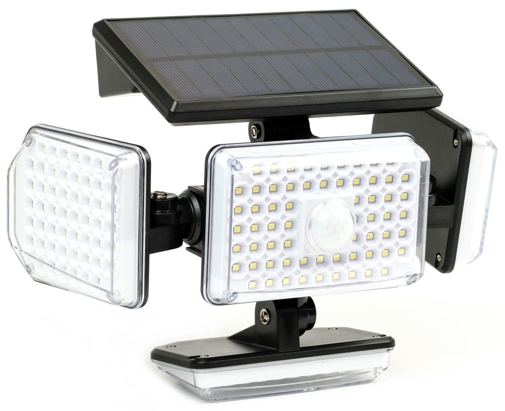 Venkovní LED reflektor s výkonem 5 W zajistí osvětlení venkovních prostor a budov v místech, kde není možný přívod elektrického proudu. Osvětlíte si například i příjezdovou cestu před garáží bez nutnosti sekání kabeláže do fasády domu. Reflektor pracuje ve 3 volitelných režimech a má tři pohyblivá ramena, díky kterým osvítí prostor před sebou, pod sebou i po stranách v úhlu 360°. Boční ramena i spodní rameno jsou otočné i sklápěcí o 160°. Napájení je zajištěno solárním panelem, který během dne ukládá energii do 2400 mAh Li-Ion vestavěné baterie. Díky senzoru pohybu se světlo automaticky aktivuje i deaktivuje.