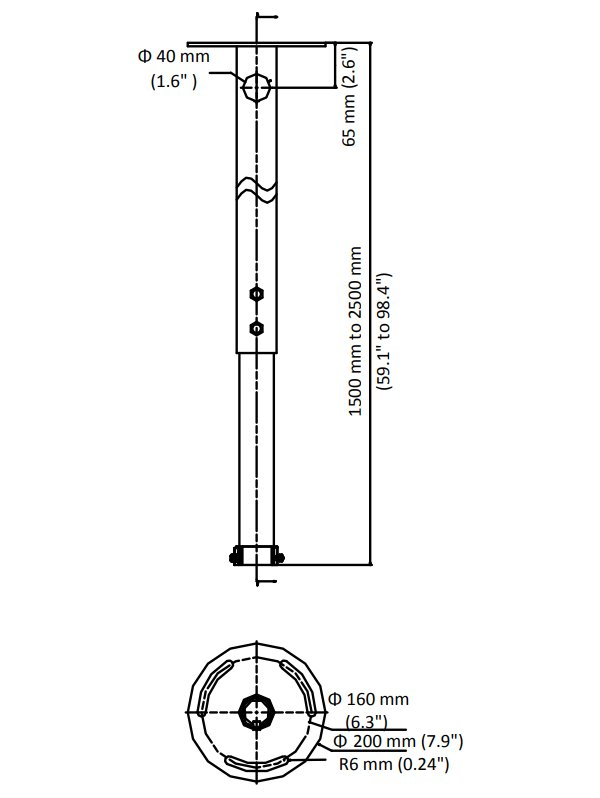 Teleskopický držák pro montáž PTZ kamer na strop, zatížitelnost 10 kg, nastavitelná délka v rozsahu 150 až 250 cm. Držák by měl být instalován na rovnou stěnu, která unese více než 3krát větší hmotnost, než je celková hmotnost kamery a držáku.