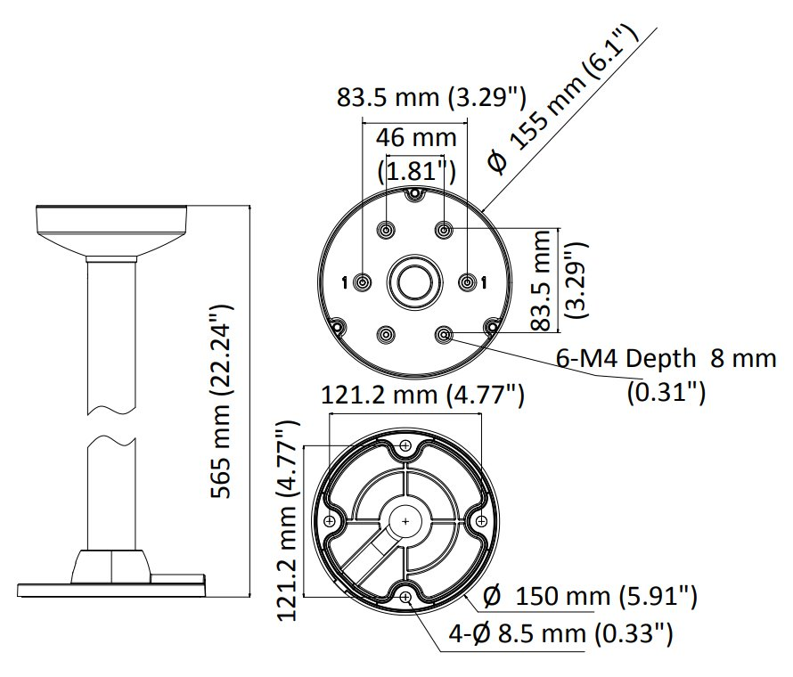 Závěsný držák pro montáž dome kamer na strop, zatížitelnost 3 kg. Držák je vhodný pro vnitřní i venkovní použití a měl by být instalován na rovný povrch. Pro venkovní použití je nutná vodotěsná vrstva izolace (těsnění). Zeď/strop musí unést více než 3krát větší hmotnost, než je celková hmotnost kamery a držáku.