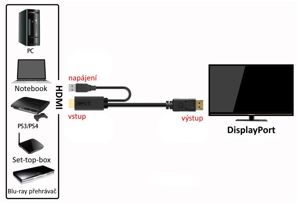 Pomocí tohoto kabelu lze propojit HDMI zdroj signálu s monitorem nebo promítačkou s konektorem DisplayPort. Přenáší obraz i zvuk a zvládá rozlišení až 4K při 60 Hz.