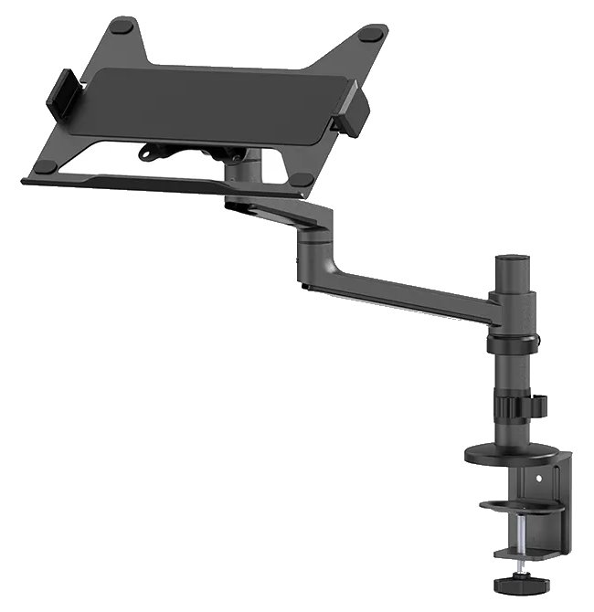 Flexibilní stolní držák pro notebooky s úhlopříčkou 11,6–17,3" a nosností až 5 kg. Držák je manuálně výškově nastavitelný v rozmezí od 24,5 do 38,8 cm. Navíc je i hloubkově nastavitelný v rozmezí od 16,2 do 49,4 cm. Díky krátkému hornímu rameni T-Rex je při umístění v blízkosti stěny nutná pouze minimální hloubka. Potěší také systém pro úhledné vedení kabelů. Balení obsahuje stolní svorku i průchodku.