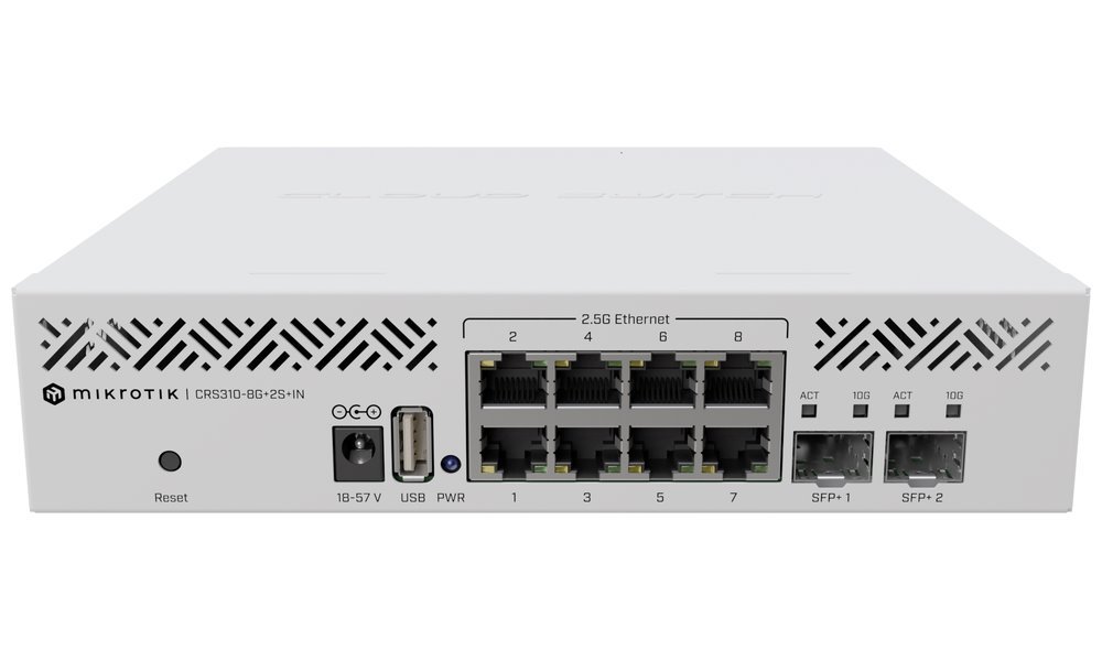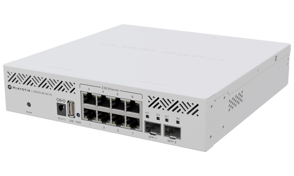 Výkonný Cloud Router Switch s osmi 2,5GbE RJ-45 porty a dvěma 10G SFP+ sloty. Tento přepínač dokáže využít plný potenciál systému RouterOS v7: provozovat sítě VLAN, rámce Jumbo, agregaci linek, pravidla ACL a mnoho dalšího.