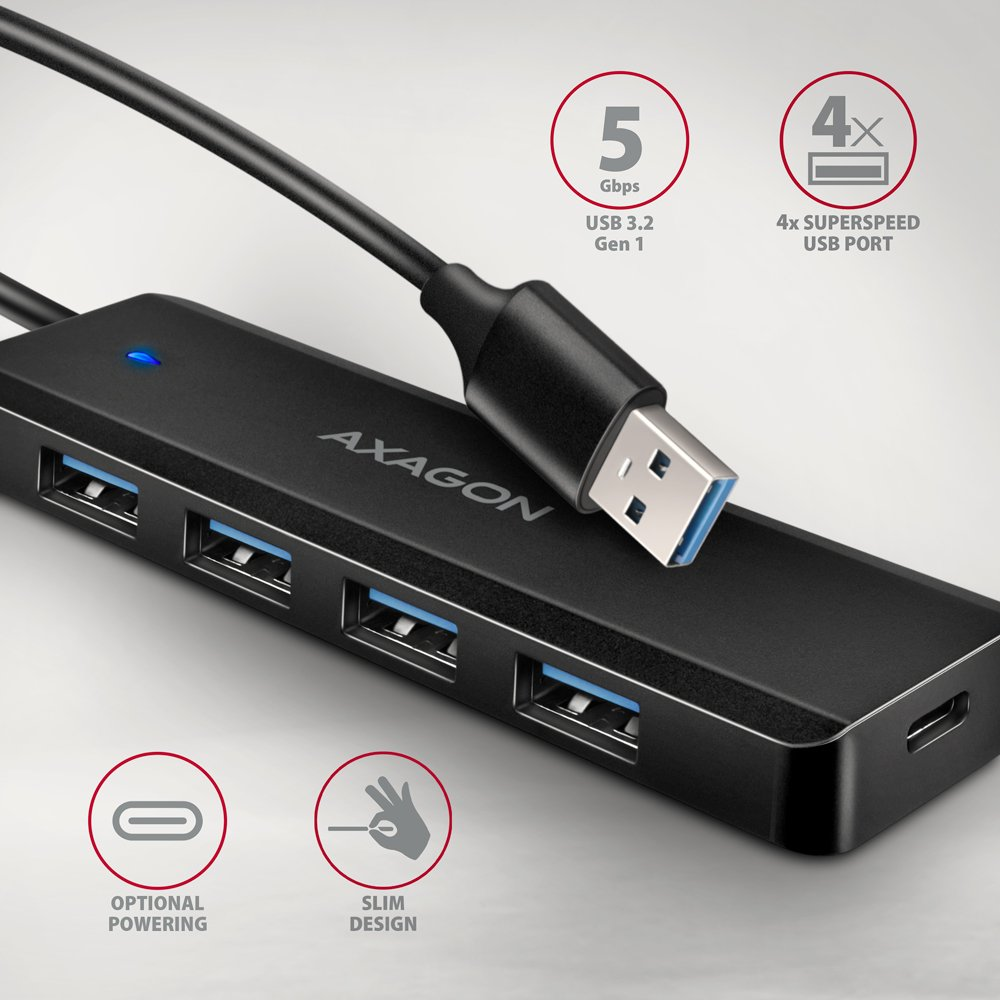 Kompaktní cestovní rozbočovač připojí k počítači až čtyři USB zařízení současně. Velkou výhodou je možnost externího napájení hubu z jakékoliv nabíječky mobilních zařízení s USB-C konektorem. Zvládne trvalé připojení až dvou externích disků i bez vlastního napájení a s vlastním napájením je možné připojit až tři 2,5" magnetické externí disky. Zároveň lze nabíjet smartphony, tablety, powerbanky a další zařízení proudem až 1,5 A (v závislosti na použité nabíječce).
