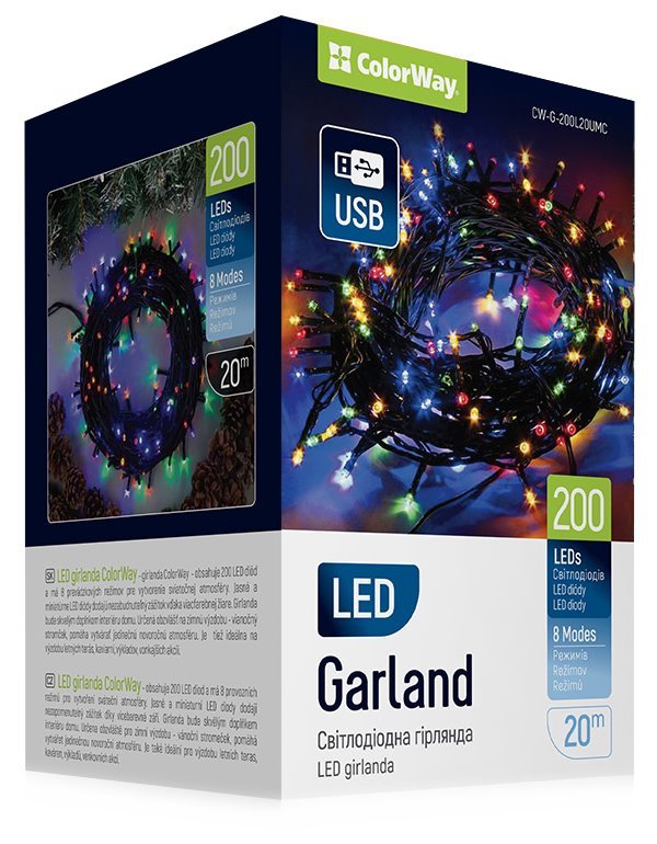 Se světelným LED řetězem ColorWay vytvoříte kouzelnou atmosféru na Vánoce či jiné slavnostní příležitosti. Řetěz obsahuje 200 miniaturních LED diod a dosahuje délky 20 metrů. Díky tomu můžete světýlka hustě osázet velký vánoční stromek nebo je rozvěsit po délce velkého pokoje v interiéru domu apod. K dispozici je celkem 8 režimů provozu. Jedná se o ideální doplněk pro dekoraci prostoru, který je vhodný nejenom na vánoční svátky. Pro napájení slouží rozhraní USB.