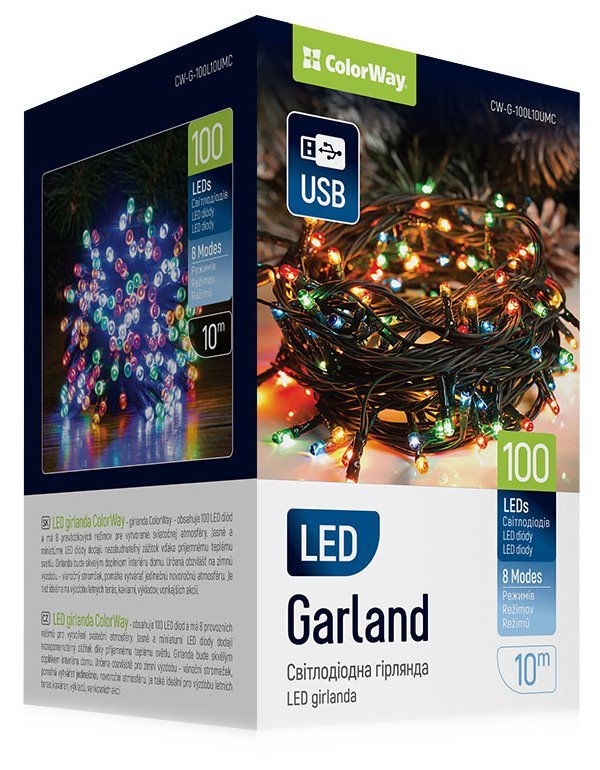 ColorWay LED řetěz má 100 LED diod a 8 režimů provozu pro slavnostní atmosféru. Nenápadný, průhledný kabel a miniaturní LED diody dodávají vzdušnost a příjemné pocity díky vícebarevné záři. Řetěz bude skvělým doplňkem interiéru domu. Vynikat bude zejména na vánočním stromku, pomáhá dotvořit jedinečnou sváteční atmosféru. Ideální pro zdobení letních teras, kaváren, výkladů a venkovních akcí.