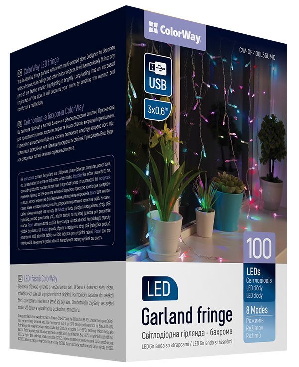 ColorWay LED třásně. Slavnostní třásňová girlanda s vícebarevnou září. Určena k dekoraci stěn, oken, schodišťových zábradlí a jiných vnitřních předmětů. Harmonicky zapadne do jakékoli části interiéru a jasně jej zvýrazní. Zvýšený jas září. Ozdobí váš domov a pomůže dotvořit pohodovou atmosféru.