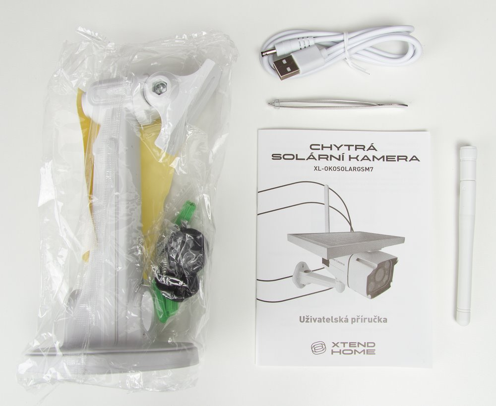 Obsah balení: kamera, solární panel, propojovací kabely, spojovací materiál, pinzeta, držák na kameru, uživatelská příručka