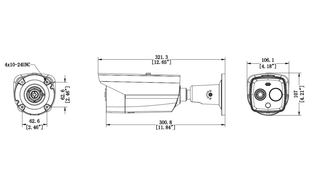 Bezpečnostní termální venkovní IP kamera s duálním snímáním v termo (256 × 192) a vizuální (2688 × 1520) oblasti. Rozlišovací schopnost pod 40 mK, objektiv f = 6,9 mm (24,9° × 18,7°), vizuální f = 6,4 mm (53° × 28°), podpora WDR (120 dB), IR a bílý LED přísvit do 30 m.