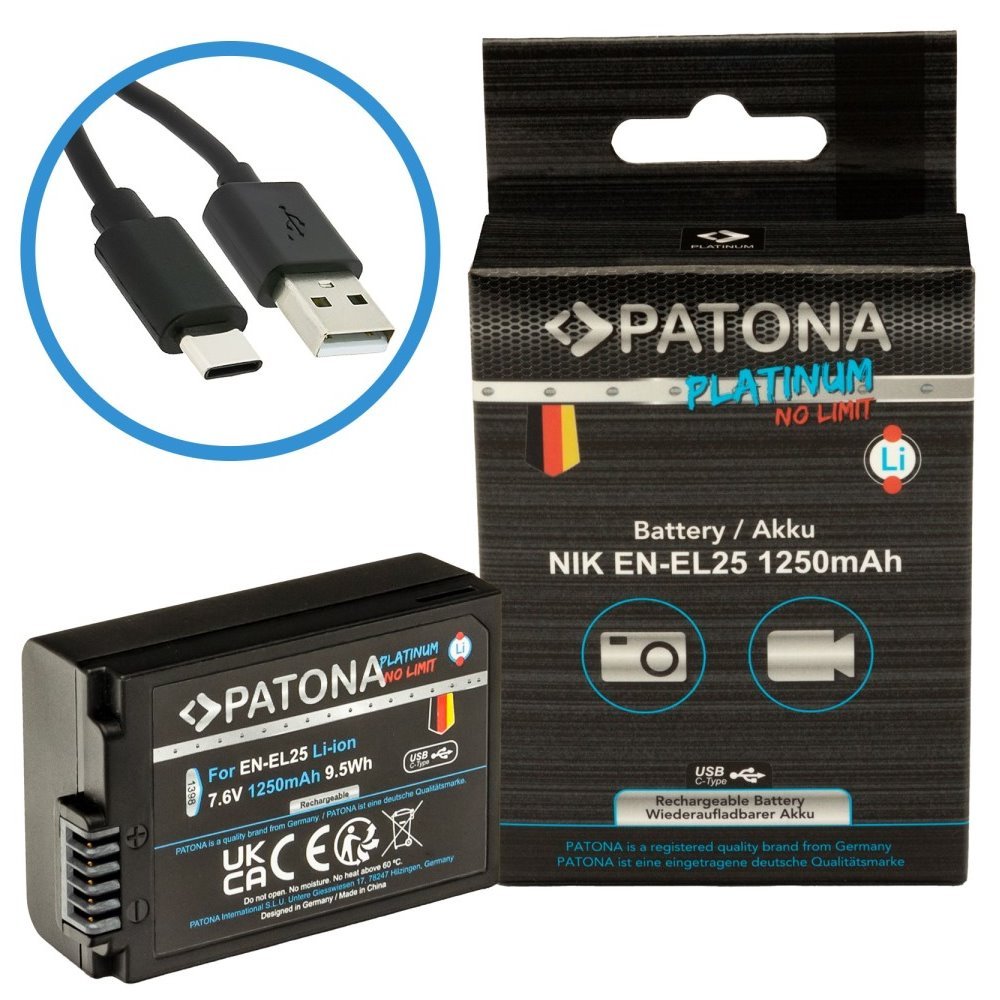 Kompatibilní baterie pro fotoaparáty Nikon. Baterie se vyznačují vysokou kvalitou, mají integrovanou ochranu proti přetížení, přebití a přehřívání. Nabíjení baterie je realizováno skrze zabudovaný konektor USB-C. Lze ji nabíjet připojením kabelu do USB-C konektoru (např. z počítače, powerbanky či nabíječkou na mobilní telefon) tak i v klasické nabíječce na Li-ion. Nabíjecí proud max. 1,2 A (vyšší vstupní proudy jsou automaticky redukovány pomocí IC ovládání baterie).