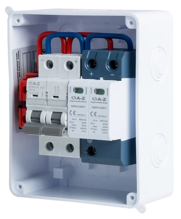 V rozváděči je osazen svodič přepětí DC třídy T1+T2 a dvoupólový DC jistič pro jištění DC vstupu střídače.