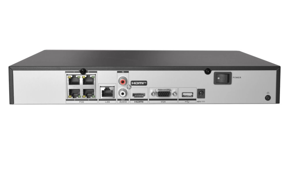 Porty: 1× HDMI 4K výstup, 1× VGA Full HD výstup, 2× USB 2.0, 1× RJ-45 (10/100/1000 Mbps), 4× RJ-45 (PoE podpora), 1× audio vstup (RCA), 1× audio výstup (RCA), 4× alarm vstup, 1× alarm výstup